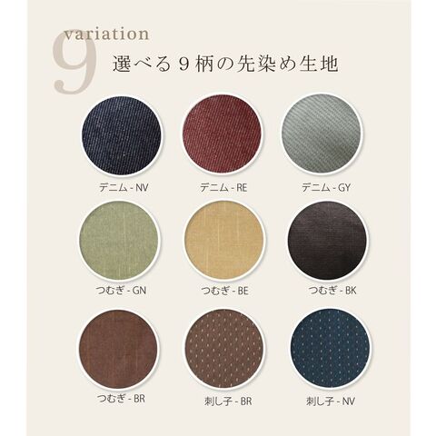| カラー | デニム(グレー/ネイビー/レッド)つむぎ(ブラウン/グリーン/ベージュ/ブラック) 刺子(ブラウン/ネイビー) |