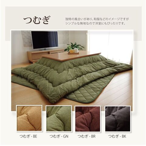 | ■綿を使用したこたつ布団です。織りで素材感を表現することにより、柔らかな味のある雰囲気に仕上げました。 ■綿はポリエステルに比べ、冬場に気になる静電気がおきにくく、繊維の中でも特に肌触りが良いのが特長です。 ■多色多サイズ展開ですのでお部屋にぴったりの色・サイズをお選び頂けます。 ■こたつの特長として1.省エネルギー、こたつは必要なところだけを暖める省エネルギー暖房器具です。2.クリーン、こたつは二酸化炭素など有害物質を出さないのでクリーンです。3.団らんの場、家族や友達が一緒にくつろげる空間、心も体もポッカポカになります。 ※本商品は圧縮梱包でのお届けとなります。商品が届きましたらお早めに開梱して頂き、2~3時間日陰干しをして頂くと復元が早まります。 ※写真は表記サイズと異なる場合がございます。 | |