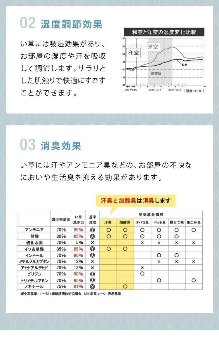 ■ い草には空気の自然浄化作用、湿度の調節作用などがあります。また汚れにくく、使用するうちに黄金色に変化し味が出ます。