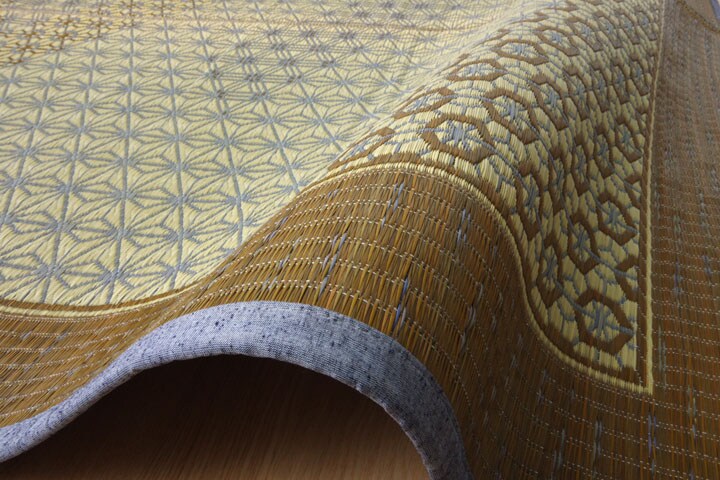 伝統工芸である組子のデザインをい草で表現したラグです。い草には空気の自然浄化作用、湿度の調節作用などがあります。ホットカーペットカバーとしても使用できます。い草に青森ヒバ加工を施しています。(抗菌、防臭効果)裏面には滑りにくい加工をした不織布を使用しているため、フローリングにも最適です。