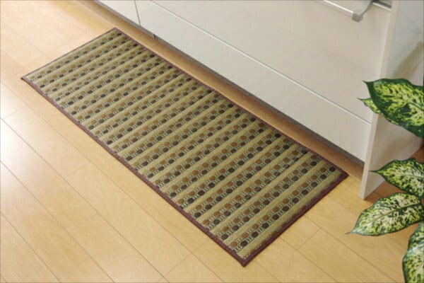 い草のキッチンマットです。キッチンマットの不満を解消してくれる商品です。化繊もののキッチンマットと比べ、汚れにくくシミになりにくいです。小さなゴミでも、ほうきで掃く、掃除機をかけるだけで取り除くことができます。い草自体が持つ油分により汚れを弾くので洗う必要がなく長くご使用いただけます。裏地にはウレタンフォームを使用しクッション性を持たせています。