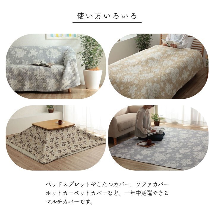 生地には天然素材の綿を100%使用し、肌に優しいマルチカバーです。水洗い加工を施しているため、ふんわりやわらかい生地になり、吸湿性も抜群です。両面使えるリバーシブルのため、気分によってお好きなデザインをお楽しみいただけます。汚れても洗濯機で丸洗いができるため衛生的です。 洗濯しても縮みにくいのも特徴です。ベッドスプレッドやこたつカバー、ソファカバー、ホットカーペットカバーなど、一年中活躍します。