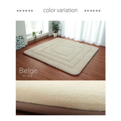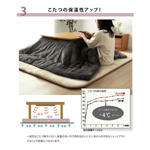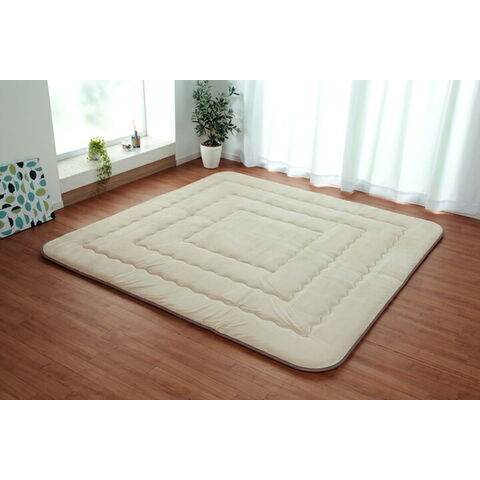 表地には肌触りが良く、耐久性に優れたマイクロファイバーを使用しています。中材にはクッション性にこだわった国産の固綿40mmを使用しています。十分な弾力性があるのでフローリングでのご使用にも最適です。遮音特級LL-30を取得しています。床下への騒音も軽減します。また、こたつと併用するとこたつの熱を床下へ逃しにくくなるので省エネ効果もあります。