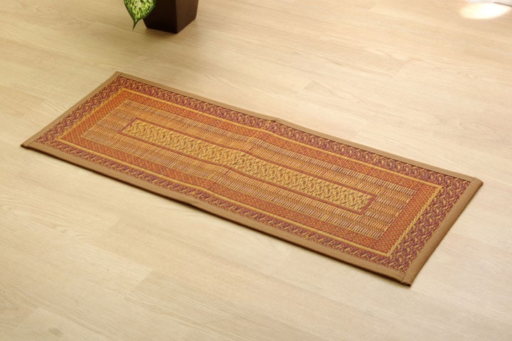 九州産のい草を使用した上がり框(かまち)です。一本一本が太く、表皮が厚く繊維がキメ細かいので弾力性があり、耐久性に優れています。また使用していくうちに綺麗な黄金色に変化していきます。い草には空気の清浄化作用、湿度の調節作用があり、汚れにくいといった特徴があります。青森ヒバ加工を施しています。(抗菌、防臭効果)裏にはウレタンを貼っていますので適度なクッション性があります。