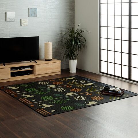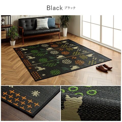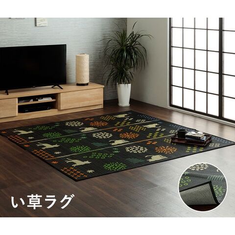 い草ラグ 猫柄 花柄 猫 インテリア 節電 夏用 涼しい おしゃれ おすすめ 湿度調節 消臭効果 お手入れ簡単 ブラック 約180×240cm はなねこ【送料無料】