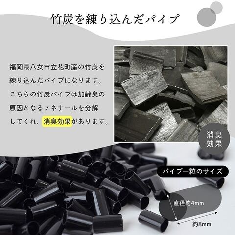ポリエチレンパイプに「竹炭」を練り込んだ、枕の中材です。練りこんだ地区単は、福岡県八女市立花町産で安心の日本製です。。こちらの竹炭パイプはノネナールを分解してくれます。手洗いもできますので、いつでも清潔にご使用できます。