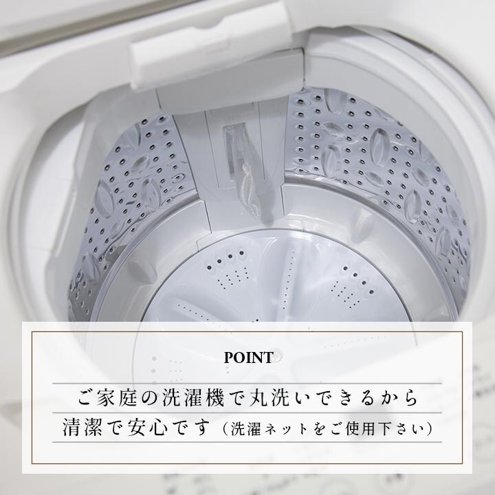 ご家庭の洗濯機での丸洗いもできるのでいつでも清潔かつ安心してお使いいただけます。(洗濯時は洗濯ネットをご使用ください。)