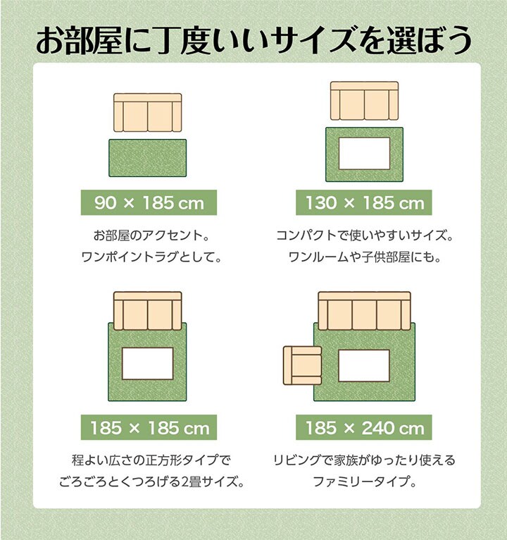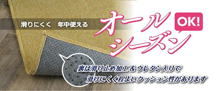 年間ご使用できる商品です。短毛使用でお掃除もしやすくまた、コンパクトに畳めます。10色展開で色々なお部屋のシーンに対応しています。ナチュラル系、ダーク系、ビンテージ系と様々なお部屋に合わせることができる優れものです。