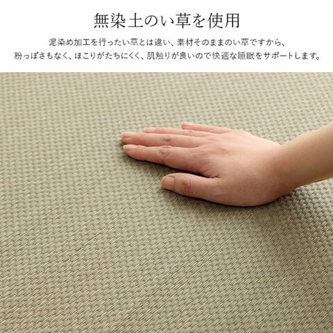 泥染め加工を行ったい草とは違い、素材そのままのい草ですから、粉っぽさもなく、ほこりがたちにくく、肌触りが良いので快適な睡眠をサポートします。