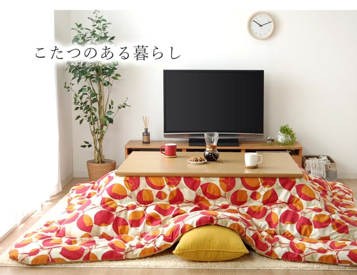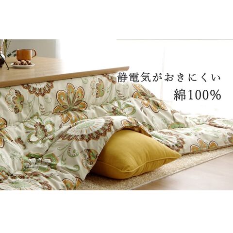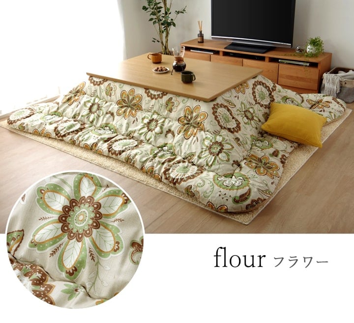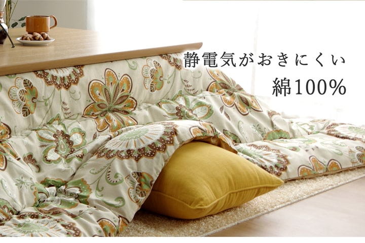 国内でプリントした綿のオックス生地を使用したこたつ布団です。四隅はラウンド型にし躓きにくいようにしました。オックス生地は繊維が太く、引っ掛かりや摩擦に強く耐久性に優れています。ざっくりとした生地は肌触り、通気性が良く、ベトつかないサラッとした手触りが特徴です。また、綿素材はポリエステル素材に比べ、冬場気になる静電気も起こりにくくなっています。部分暖房のコタツは電気代もおトクです。