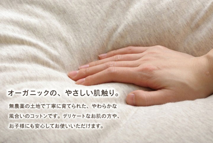 側地素材にオーガニックコットンを使用。無農薬の畑で丁寧に育てられた、人と環境にやさしいコットンです。その自然な風合いは気持ちよく、肌にもとびきりの優しさです。デリケートなお肌の方やお子様にも安心です。綿の産地、インド産の綿を使用しています。綿はポリエステルに比べ、静電気が起きにくく、繊維の中でも特に肌触りがよいのが特徴です。季節を選ばずオールシーズンご使用頂けます。ご家庭の洗濯機で洗えるので、清潔にご使用頂けます。