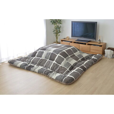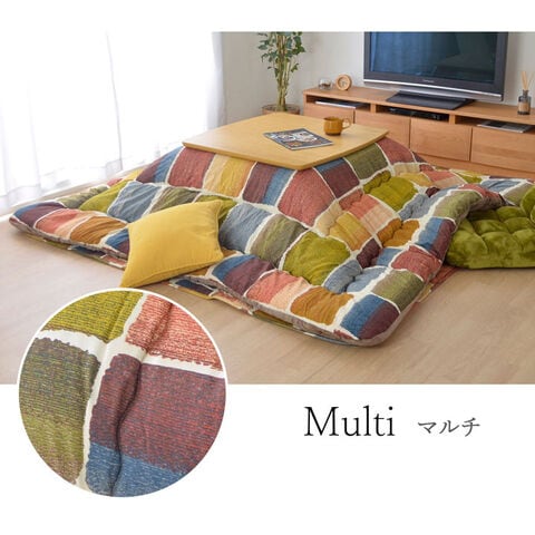 パッチワーク風のデザインをしたこたつ布団です。国内でわた入れをしています。側地にはポリエステル素材を起毛させた柔らかい生地を使用しています。部分暖房のこたつは電気代もおトクです。