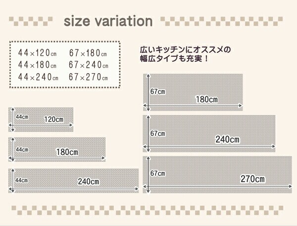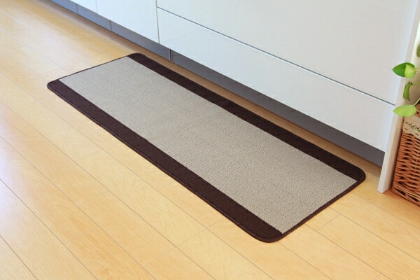 シンプルな無地のキッチンマットです。あえて厚さを薄め(約7mm)にすることにより、システムキッチンでも引っかかりにくい仕様にしています。裏面には滑りにくい加工を施しています。ご家庭の洗濯機で洗えます(ネット使用)ので、清潔にご使用頂けます。