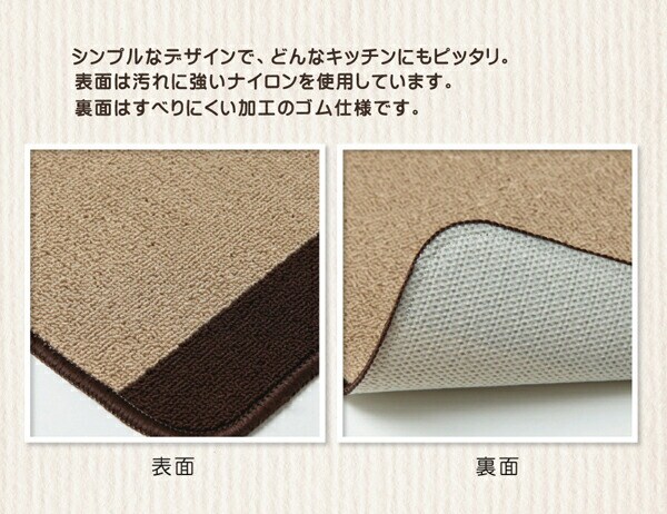 シンプルな無地のキッチンマットです。あえて厚さを薄め(約7mm)にすることにより、システムキッチンでも引っかかりにくい仕様にしています。裏面には滑りにくい加工を施しています。ご家庭の洗濯機で洗えます(ネット使用)ので、清潔にご使用頂けます。