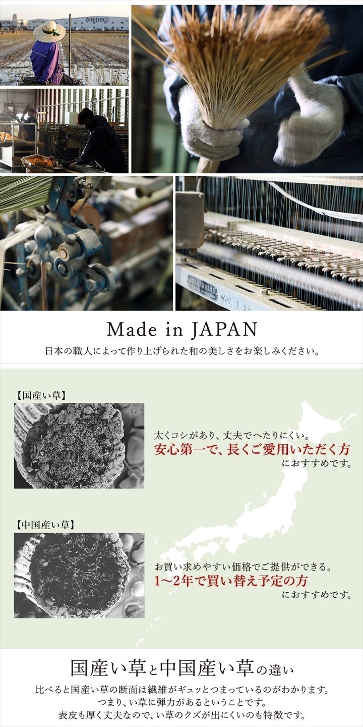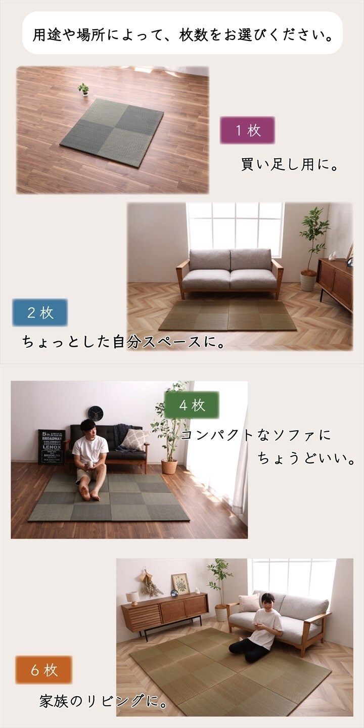 届いたユニット畳を床に置くだけで和のスペースが出来上がります。ヘリの無い、半畳タイプです。同系色の色で飽きのこない、落ち着いた市松柄を出しました。表生地には国産(九州産)のい草を使用しています。一本一本が太く、表皮が厚く、繊維がキメ細かいので弾力性があり、耐久性に優れています。い草には空気の自然浄化作用、湿度の調節作用などがあります。また汚れにくく、使用するうちに黄金色に変化し、味が出ます。軽量タイプなので、持ち運び、設置、片づけなども楽にできます。裏の不織布にはすべり止め加工を施しています。また、連結用のテープを使用すれば、お部屋に合わせて簡単に何枚でもつなげることが出来ます。
