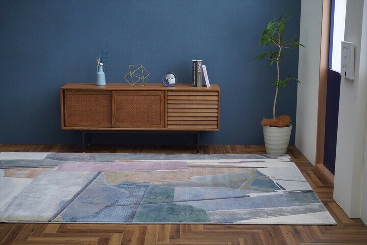 斬新なデザインが特徴的で様々なお部屋にも合わせやすいアブストラクト柄のウィルトンラグ。