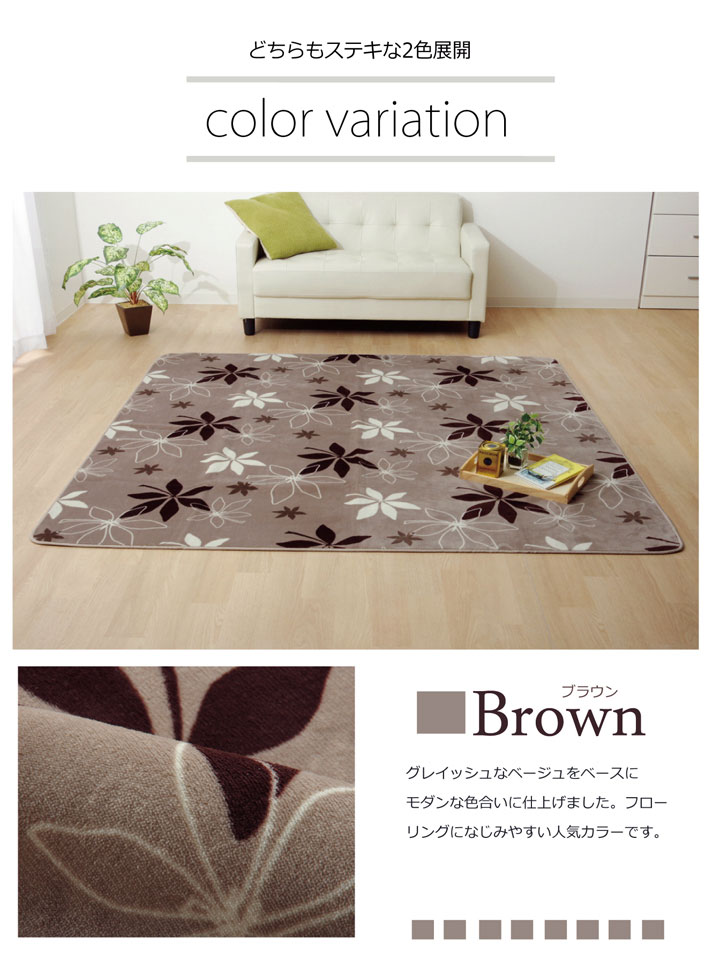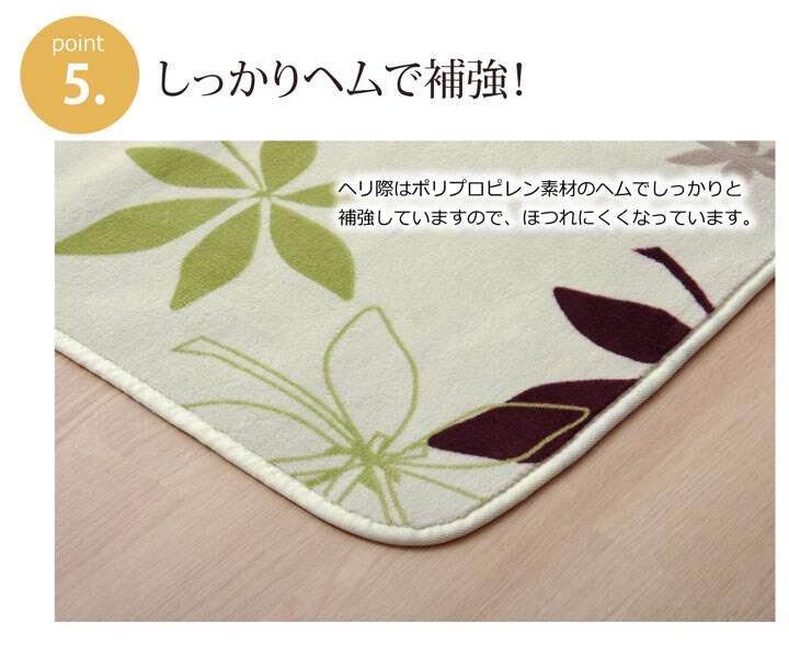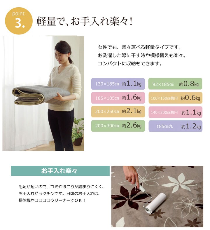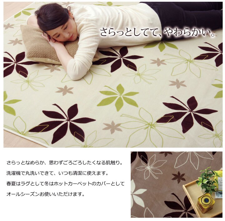生地に抗菌・防臭加工を施した、ラグカーペットです。表地にはフランネルと呼ばれる、しっとりとして非常に柔らかい生地を使用しています。軽量で持ち運びが楽々です。薄手で小さく折りたたむことができますので、収納時にも場所を取りません。フローリングを傷つけにくいよう、裏には不織布を貼っています。ご家庭の洗濯機で洗えるウォッシャブル仕様ですので、清潔にご使用頂けます。電気カーペットカバーとしてもご使用頂けます。季節を選ばすオールシーズンご使用頂けます。多サイズ展開で、ワンルームから子ども部屋、リビング・ダイニング、ベッドサイド、ソファ前にも。いろいろなシーンに合わせてお選び下さい。