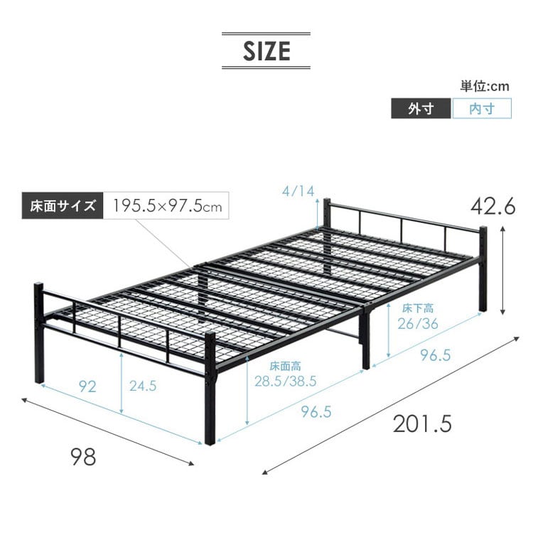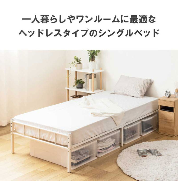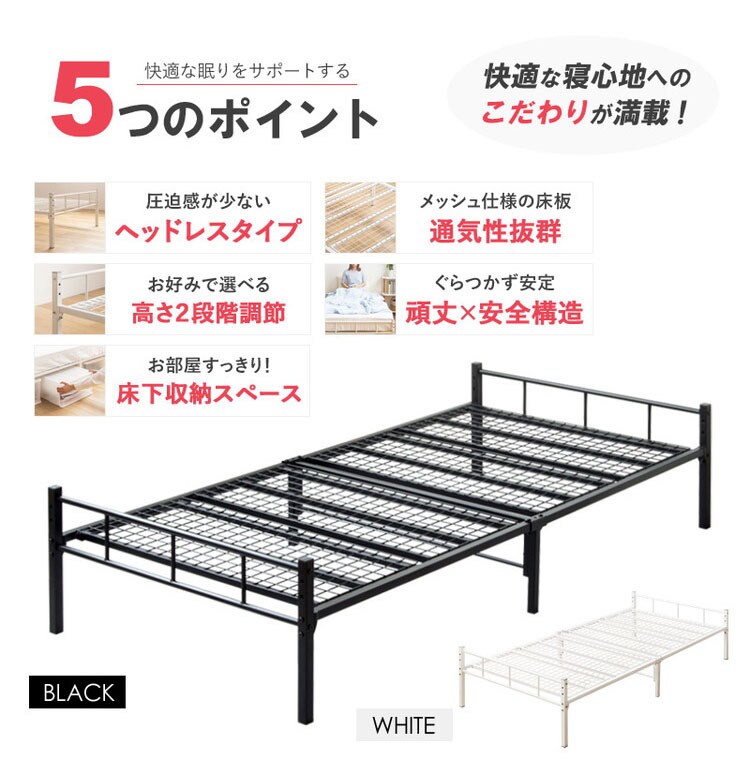 ヘッドレスベッド パイプベッド シングル ベッド フレーム 頑丈 耐荷重200kg 高さ調整 カビ予防 ダニ予防 シングルベッド ベッドフレーム ベッド下収納 シンプル 白 黒 ホワイト ブラック【送料無料】