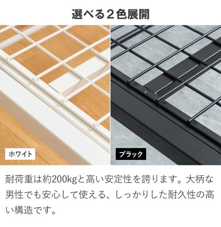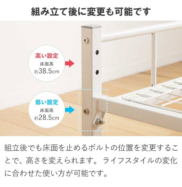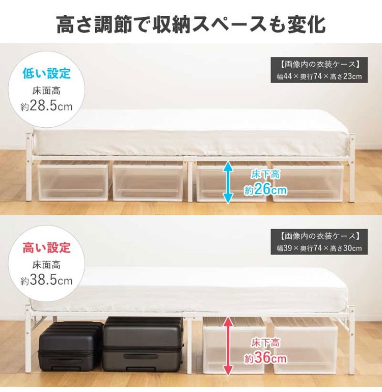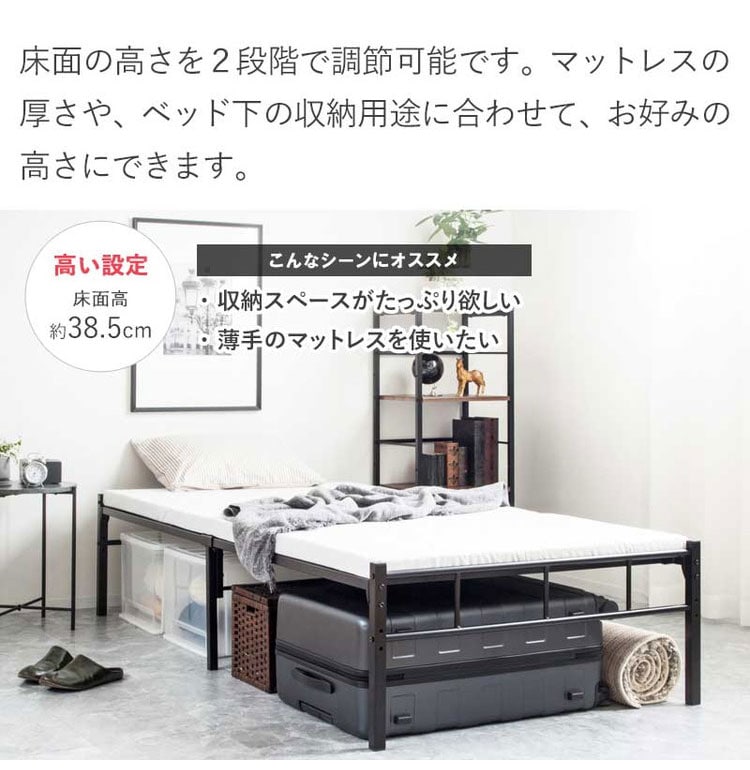 床面の高さを2段階で調節可能です。マットレスの厚さや、ベッド 下の収納用途に合わせて、お好みの高さにできます。
