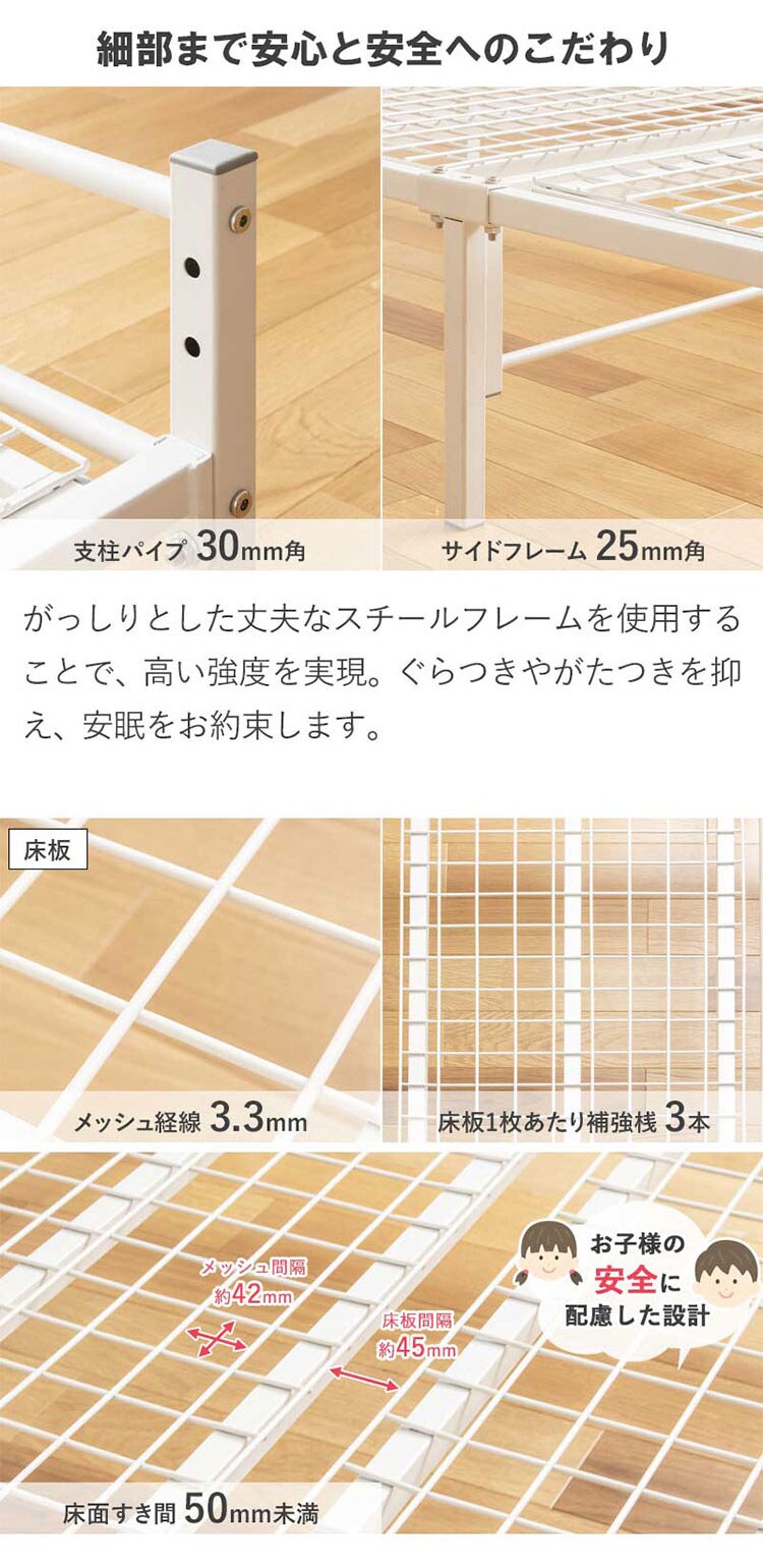 ベッド下は広々とした 収納スペースになり、お部屋もスッキリ!こだわりの頑丈設計で安心の眠りを お届けします。
