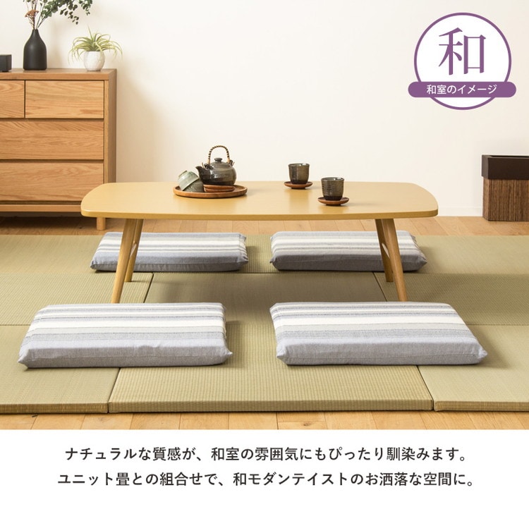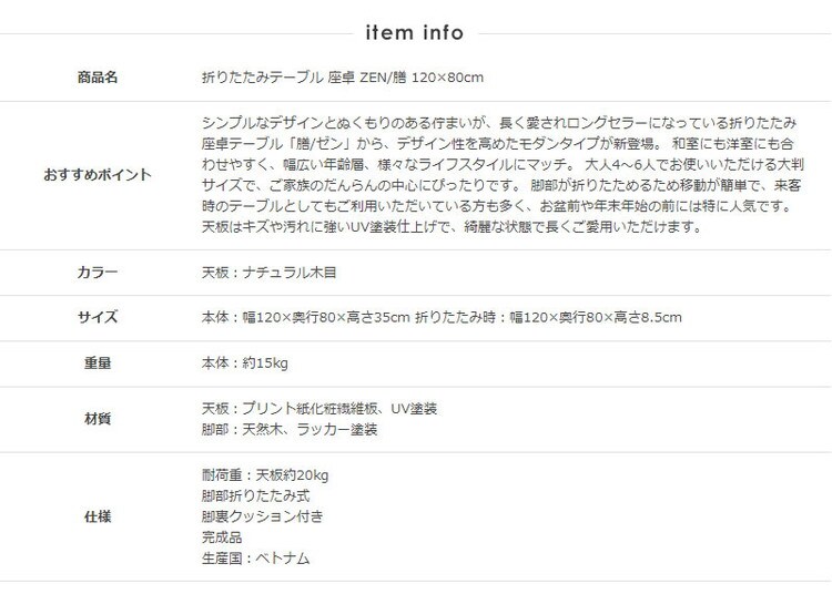 シンプルなデザインとぬくもりのある佇まいが、長く愛されロングセラーになっている折りたたみ座卓テーブル「膳/ゼン」から、デザイン性を高めたモダンタイプが新登場。 和室にも洋室にも合わせやすく、幅広い年齢層、様々なライフスタイルにマッチ。 大人4~6人でお使いいただける大判サイズで、ご家族のだんらんの中心にぴったりです。 脚部が折りたためるため移動が簡単で、来客時のテーブルとしてもご利用いただいている方も多く、お盆前や年末年始の前には特に人気です。 天板はキズや汚れに強いUV塗装仕上げで、綺麗な状態で長くご使用いただけます。
