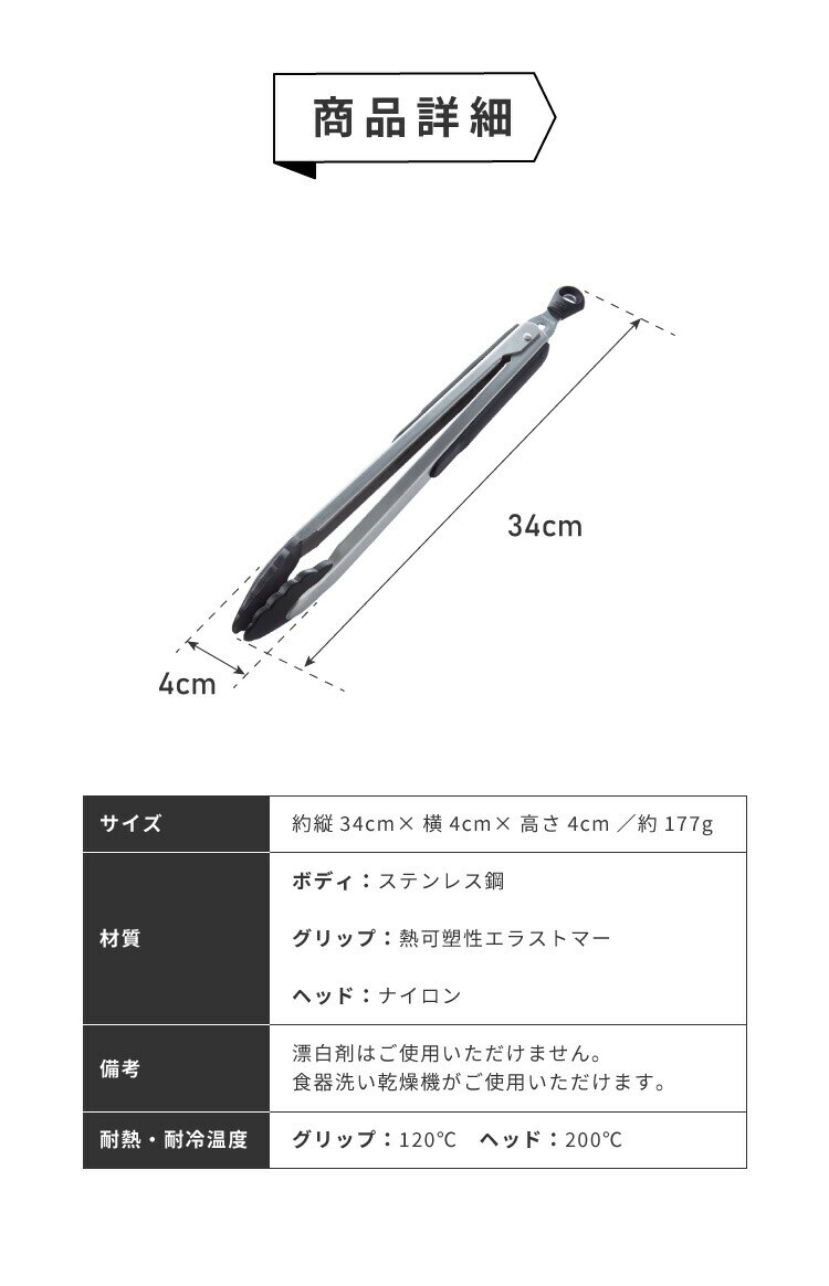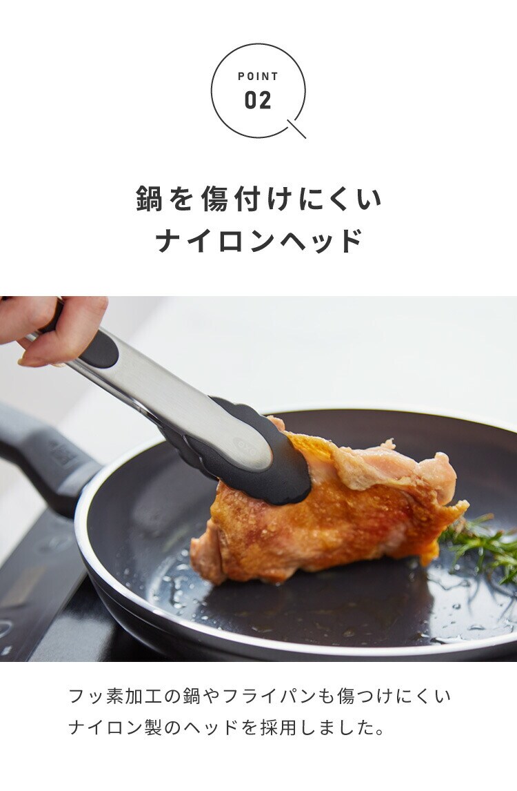 ナイロン製のヘッドでフッ素加工の鍋やフライパンも傷つけにくいのが、このナイロンヘッドロックトングです。