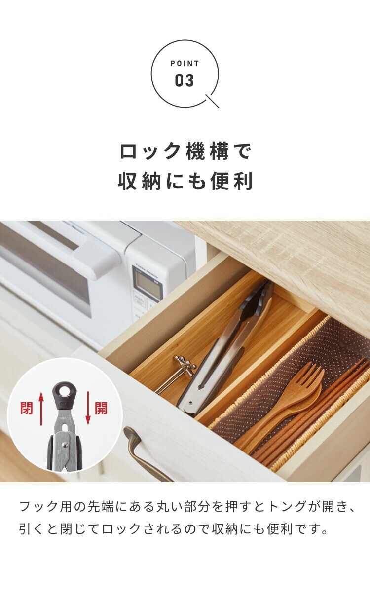 フック用の先端にある丸い部分を押すとトングが開き、引くと閉じてロックされるので収納にも便利です。
