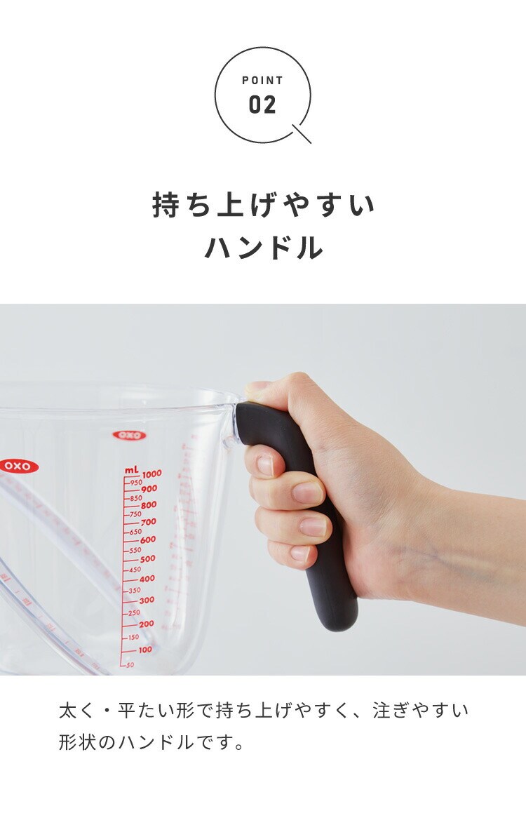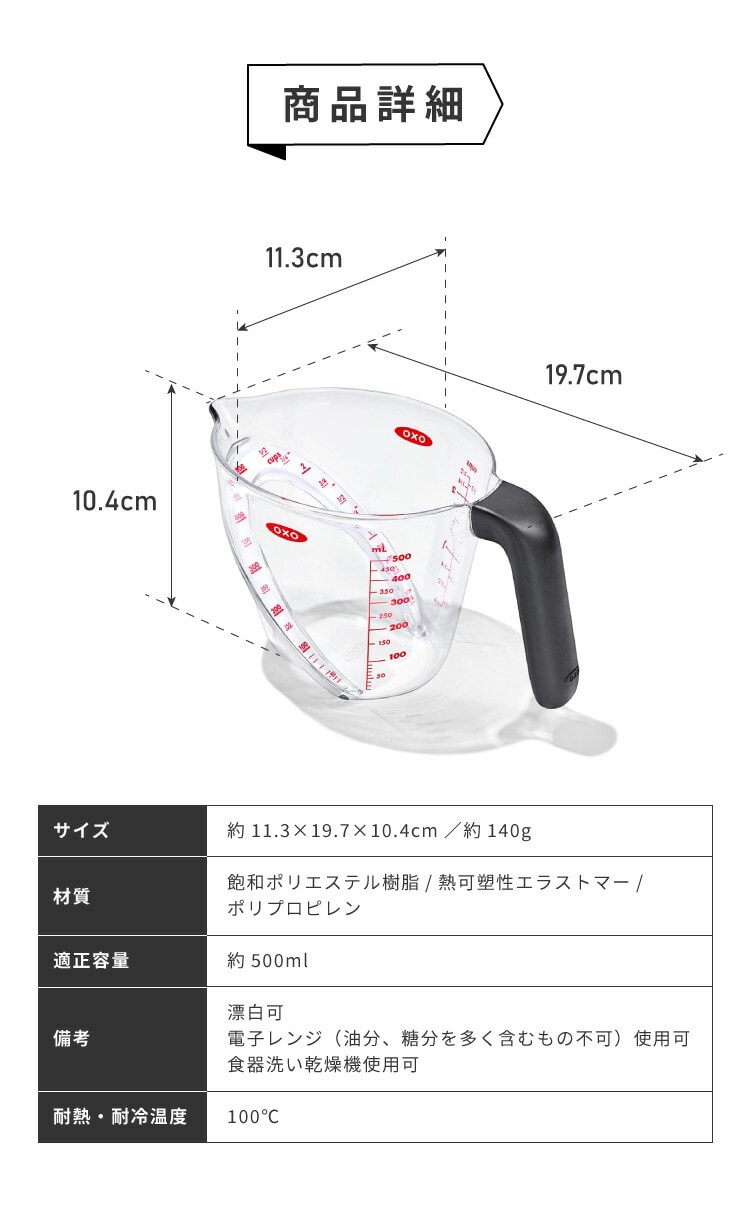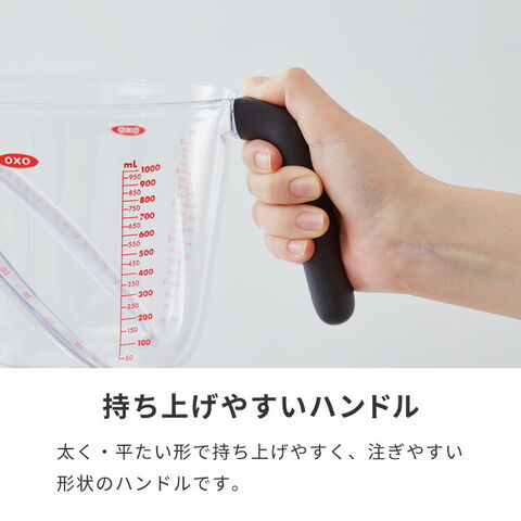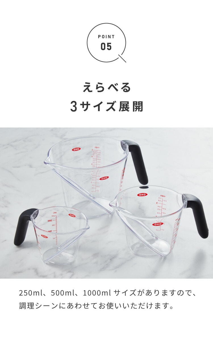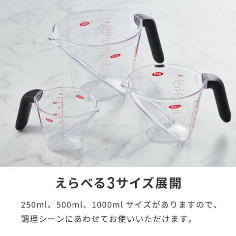 500mlサイズはスープを作る際や鍋でご飯を炊く際など分量が多めのレシピの時に、何度も計量し直す手間が省けます。