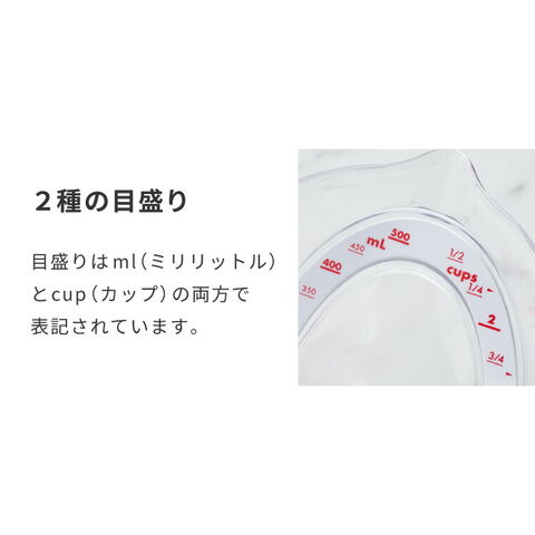目盛りはml(ミリリットル)とcup(カップ)の両方で表記されています。