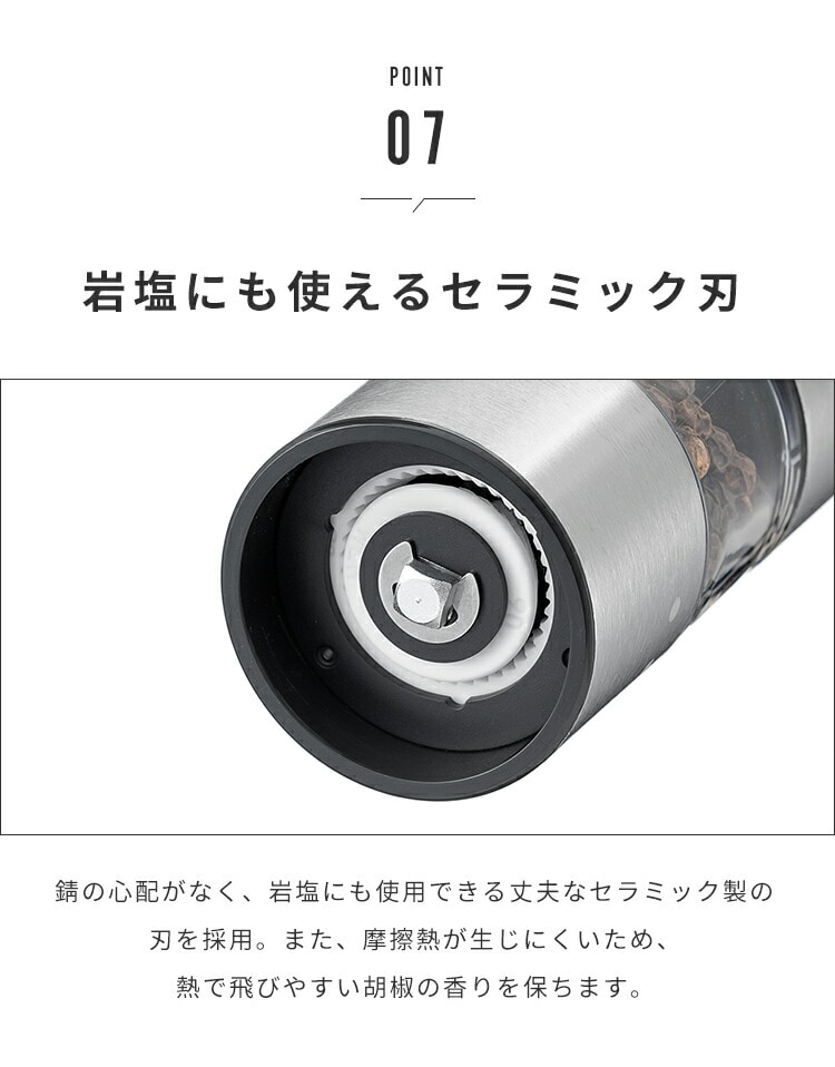 錆の心配がなく、岩塩にも使用できる丈夫なセラミック製の刃を採用。