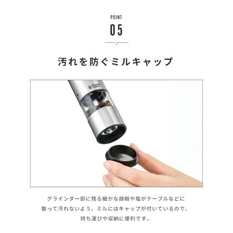 グラインダー部に残る細かな胡椒や塩がテーブルなどに散って汚れないよう、ミルにはキャップが付いているので、持ち運びや収納に便利です。