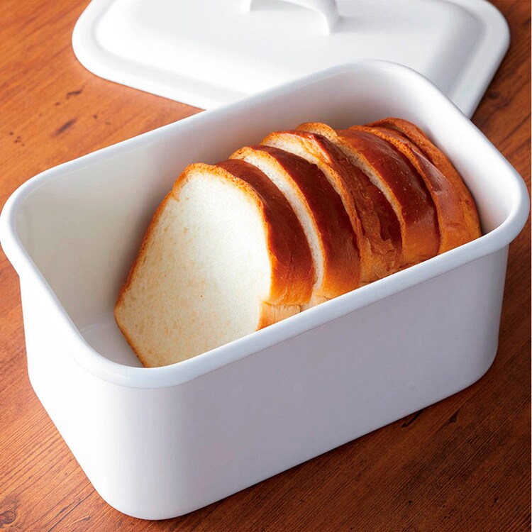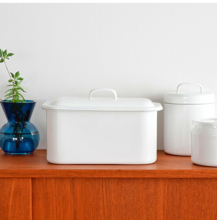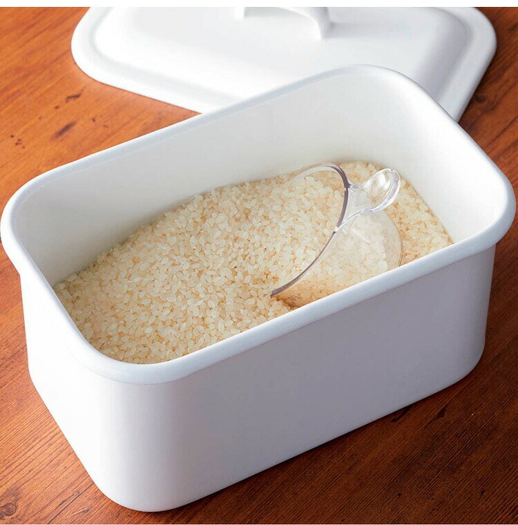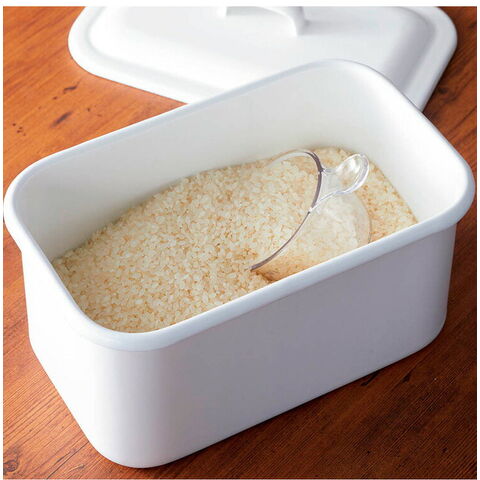 米びつやブレッドケースにもおすすめのレクタングルキャニスターです。琺瑯は食材の匂いが付きにくく、お米やパンの保存にもおすすめ。