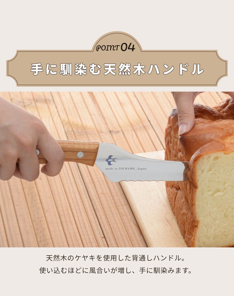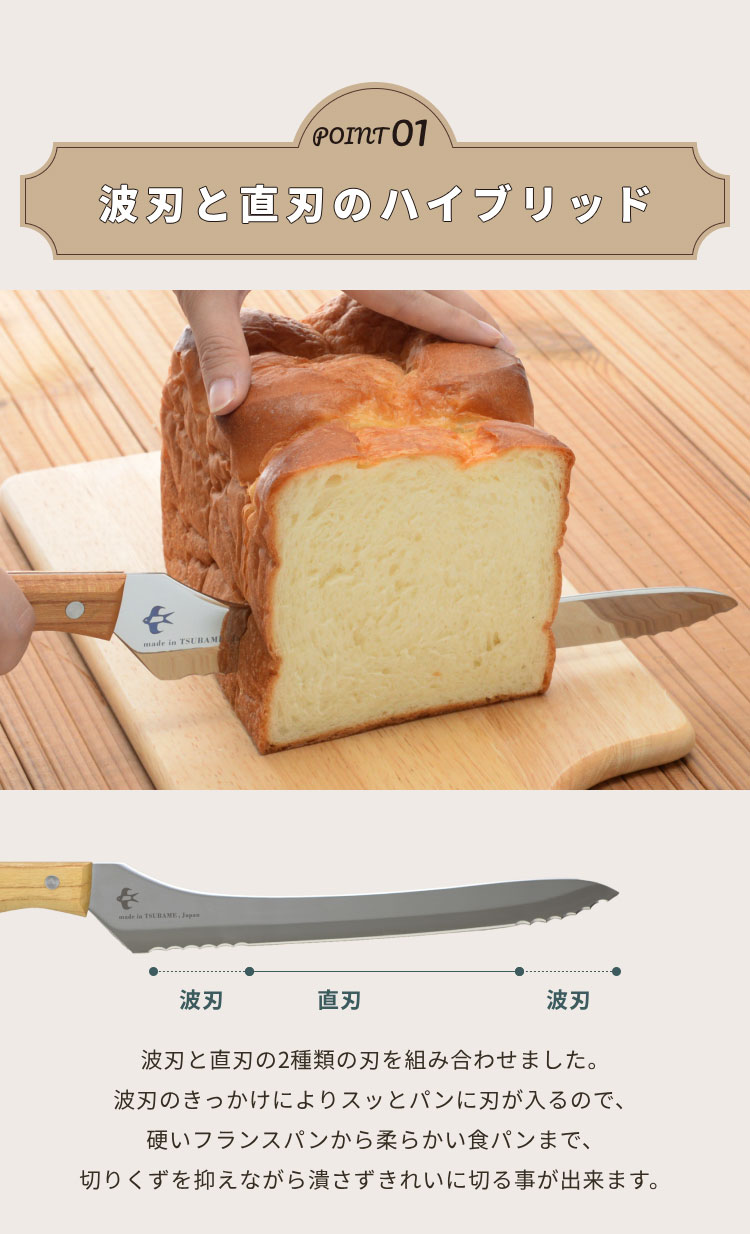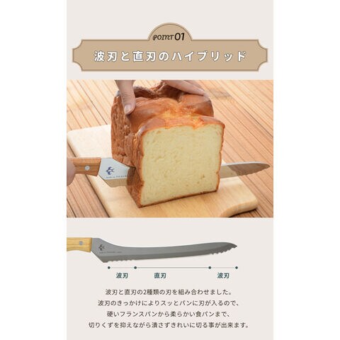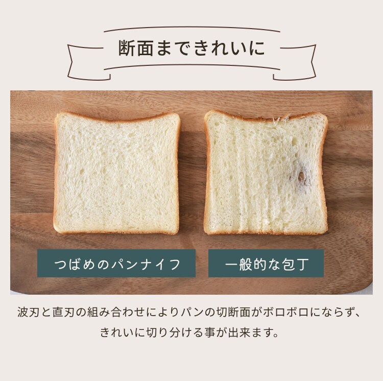 波刃と直刃の2種類の刃の組み合わせにより、パンの切りくずを抑えながらきれいに切り分けられるパンナイフです。