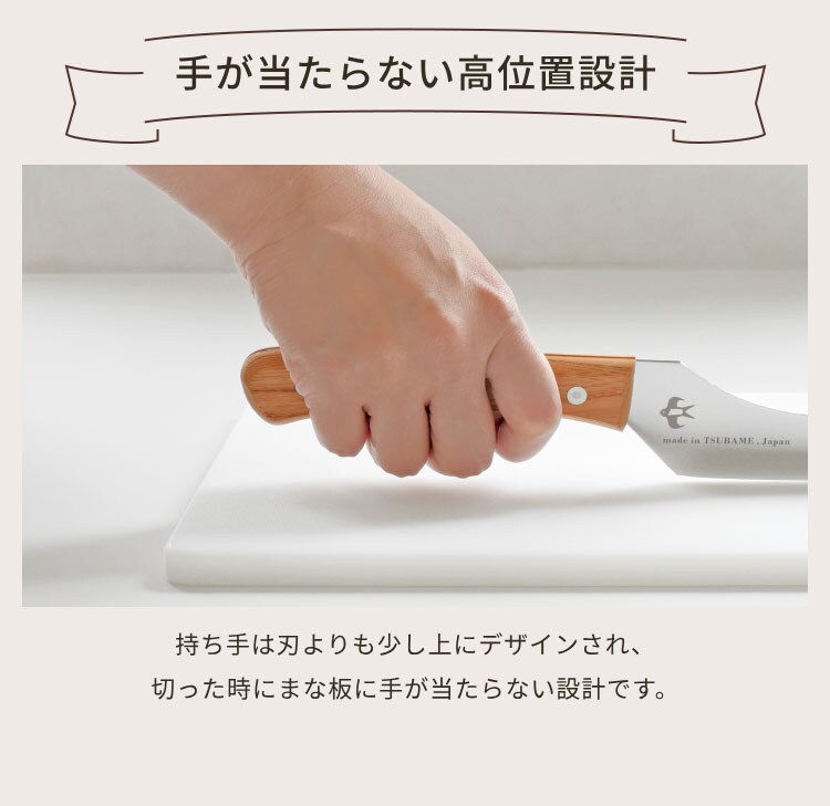 刃よりも少し上になるようにデザインされており、切った後にまな板に指が当らない親切設計です。