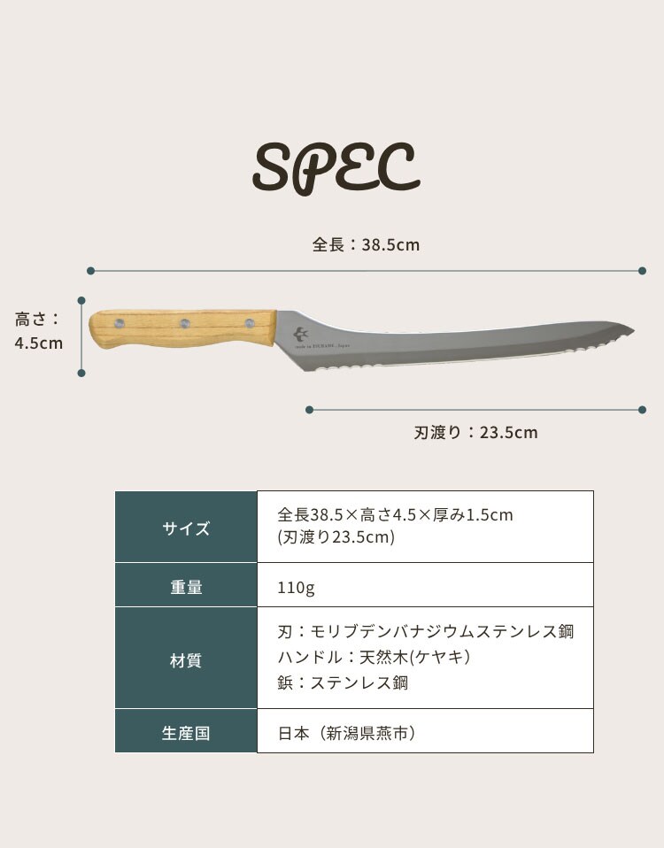 刃渡り23.5cmと長く、色々な大きさのパンやホールのケーキにも便利です。