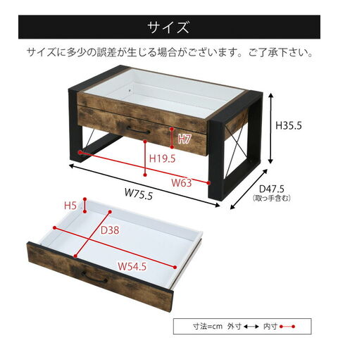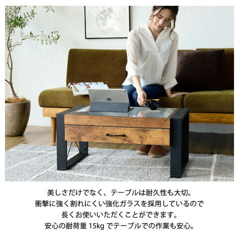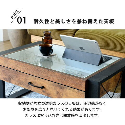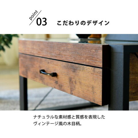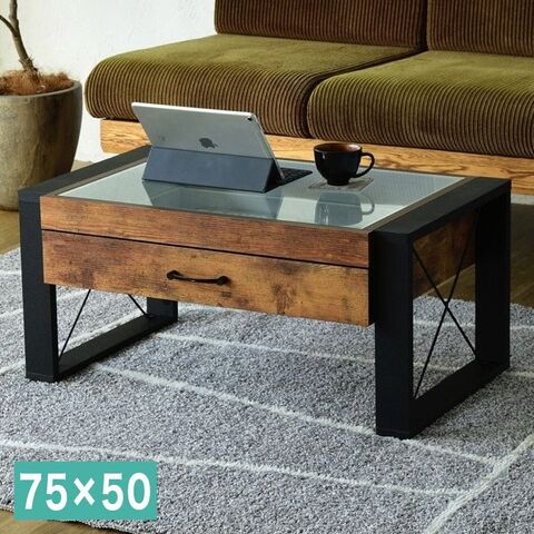 ヴィンテージ調 センターテーブル 75×50 引き出し ガラス天板 ローテーブル おしゃれ ガラステーブル ディスプレイ ブルックリン【送料無料】