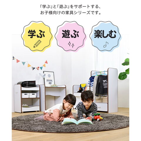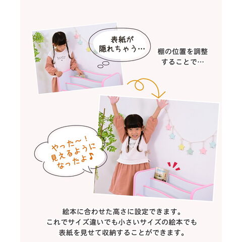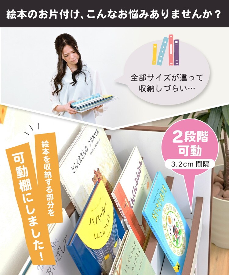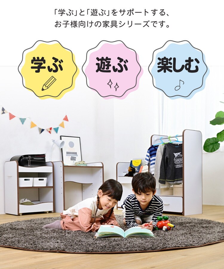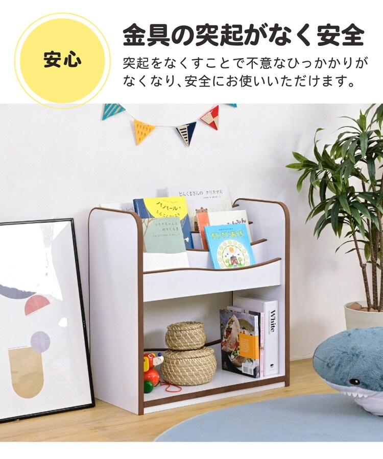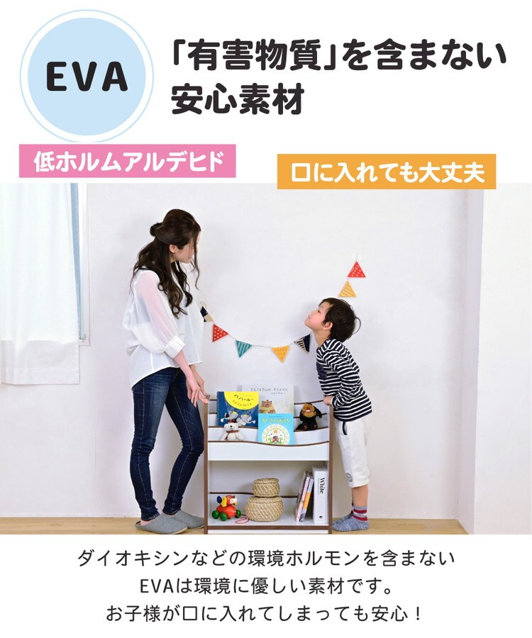 弾力性、衝撃吸収に優れたEVA樹脂をすべてのフチに採用。さらに角を丸くして金具の使用を極力減らした、小さなお子様も安全にご使用いただけるシリーズです。お子様の目線に合わせた絵本ラックは、表紙が見えるので自分で読みたい絵本を選べます。サイズがバラバラの絵本も綺麗に収納できる可動棚を採用。