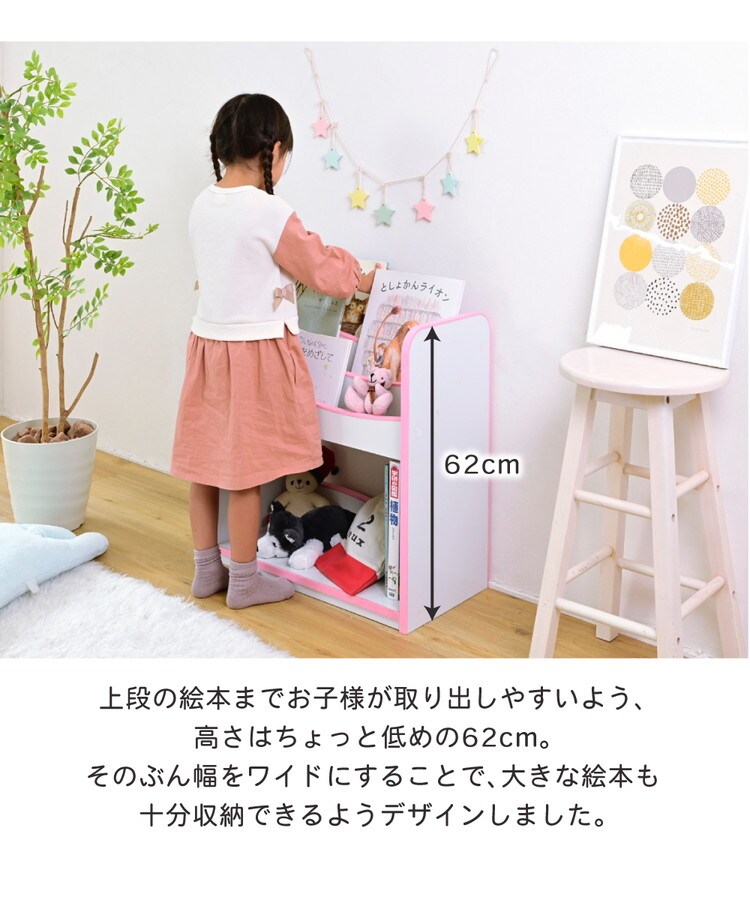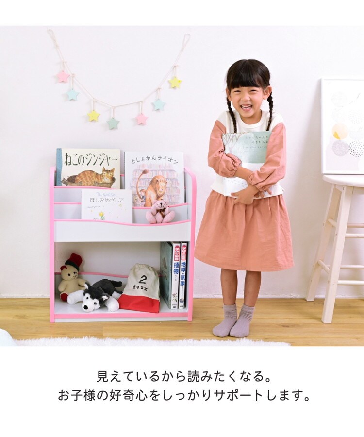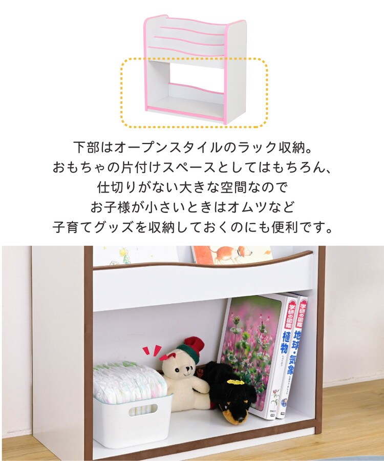 幅60、おもちゃ箱、収納ボックス、片付け、子供部屋、子ども、キッズ、木製棚、整理棚、薄型、カラフル、見せる収納、ラック、スリム収納、収納、棚付絵本ラック、おしゃれ、かわいい、ジュニア家具、キッズ家具、安全、安心、男の子、女の子