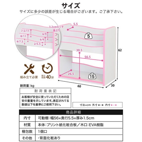 (絵本棚下段)幅56.5×奥行5.5×高さ(棚ハイ)2~4(棚ロー)5.5~7.5cm