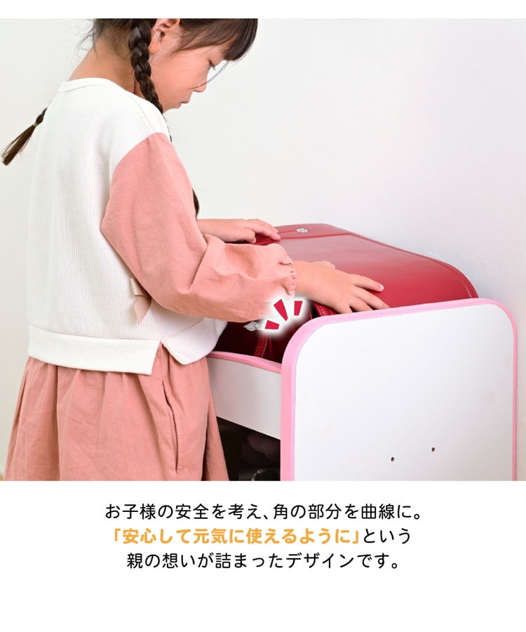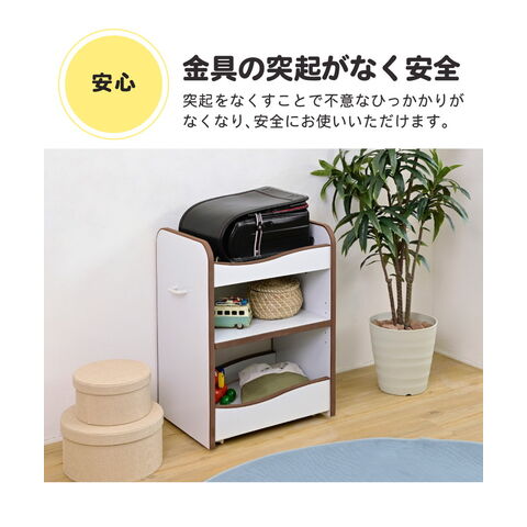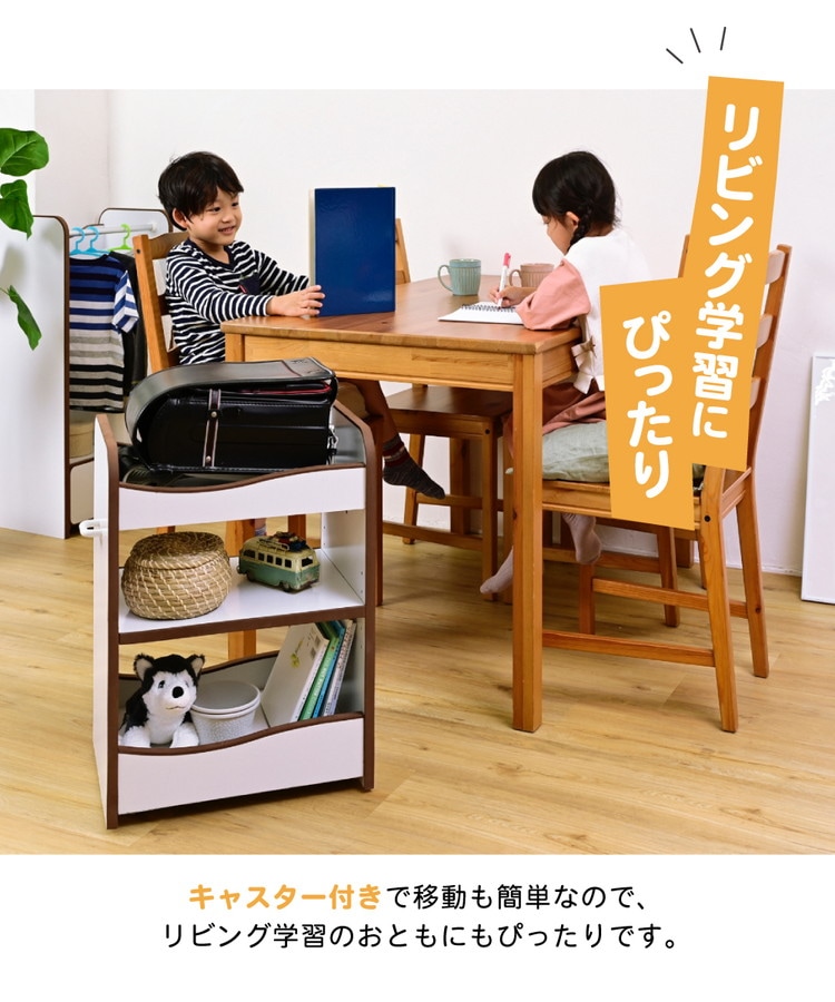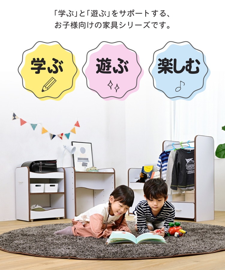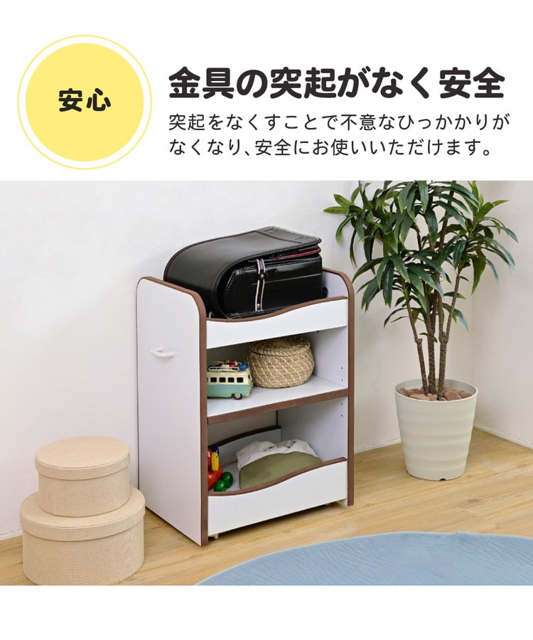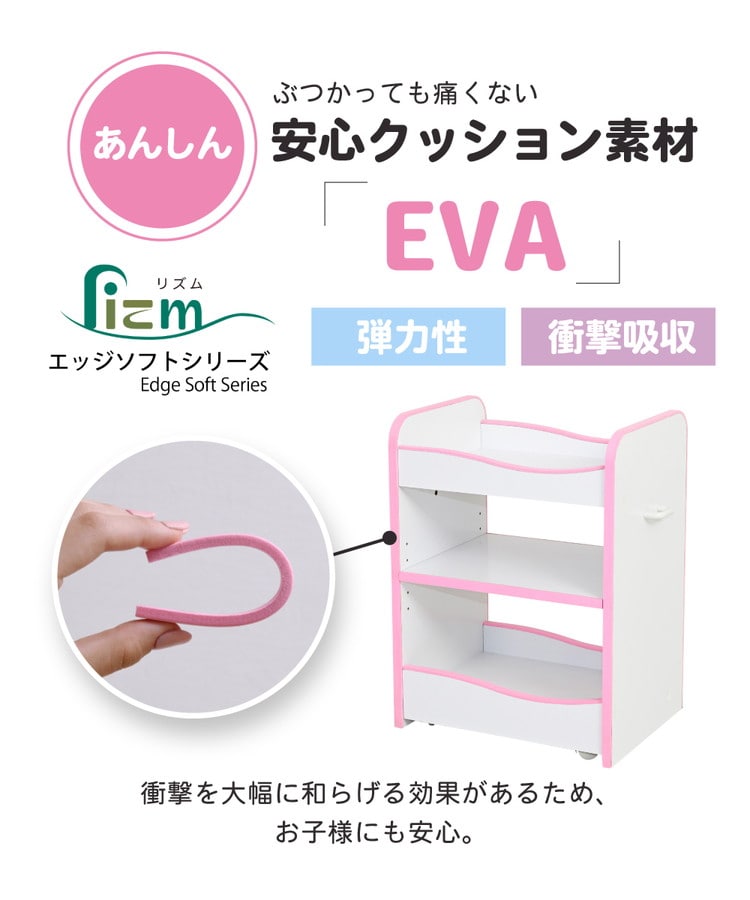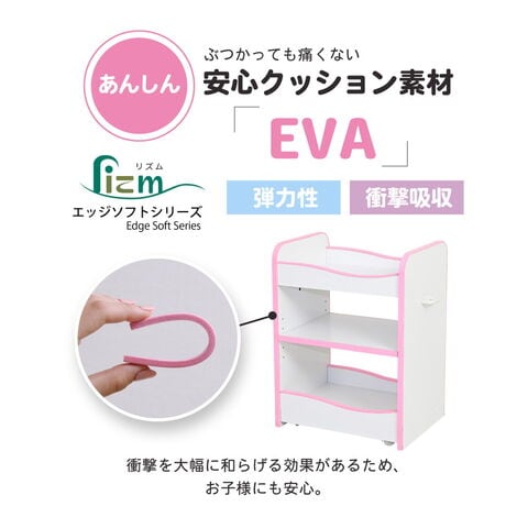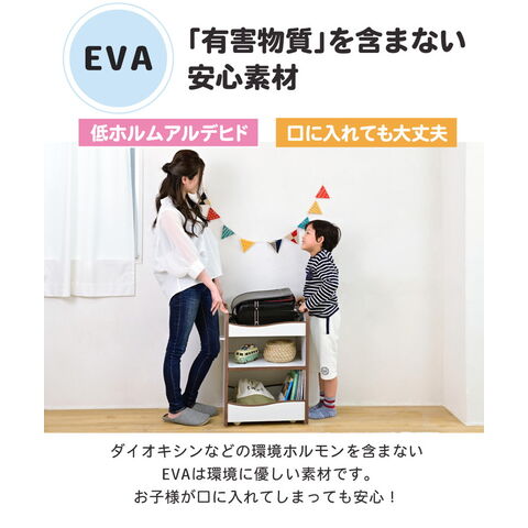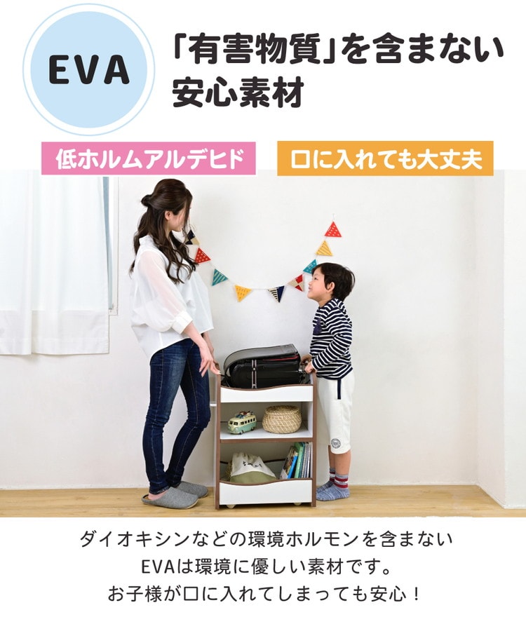 弾力性、衝撃吸収に優れたEVA樹脂をすべてのフチに採用。さらに角を丸くして金具の使用を極力減らした、小さなお子様も安全にご使用いただけるシリーズです。お子様の目線に合わせた収納ワゴンは、ランドセルも置けるサイズ感。キャスター付きなので移動が楽々で、子供部屋だけでなくリビング学習のお供にも。
