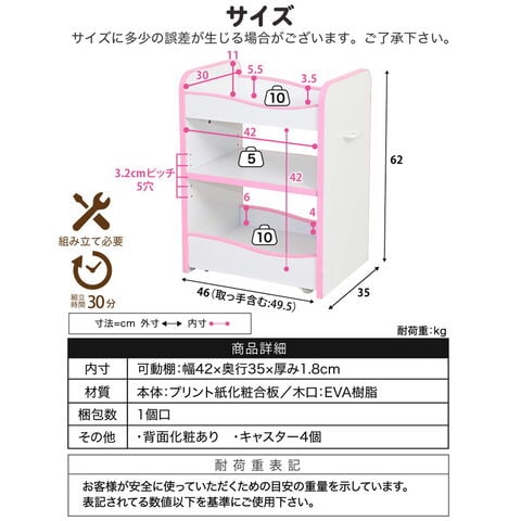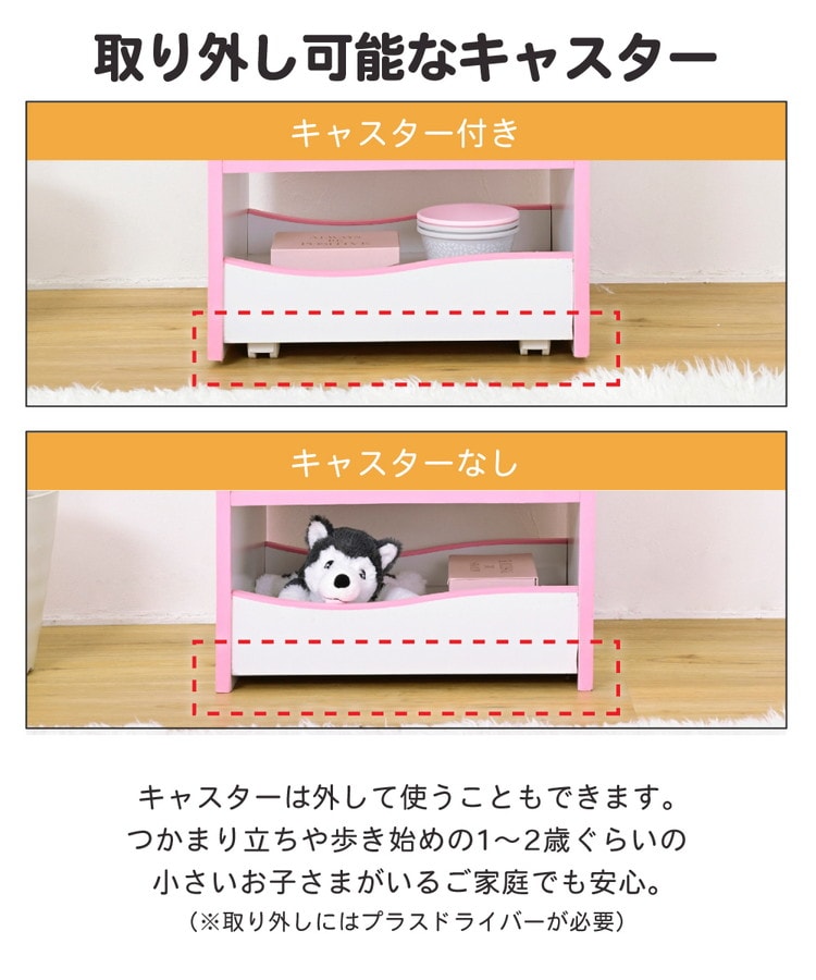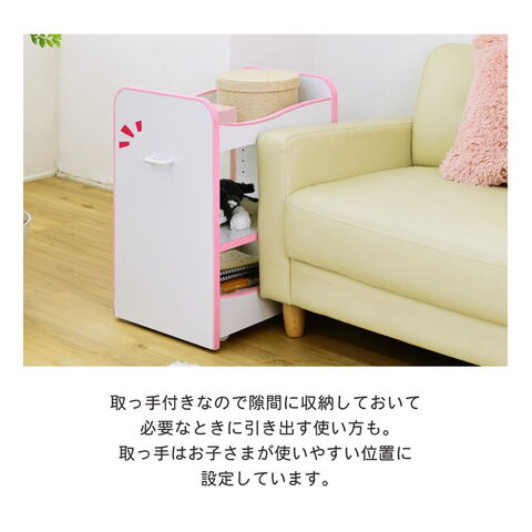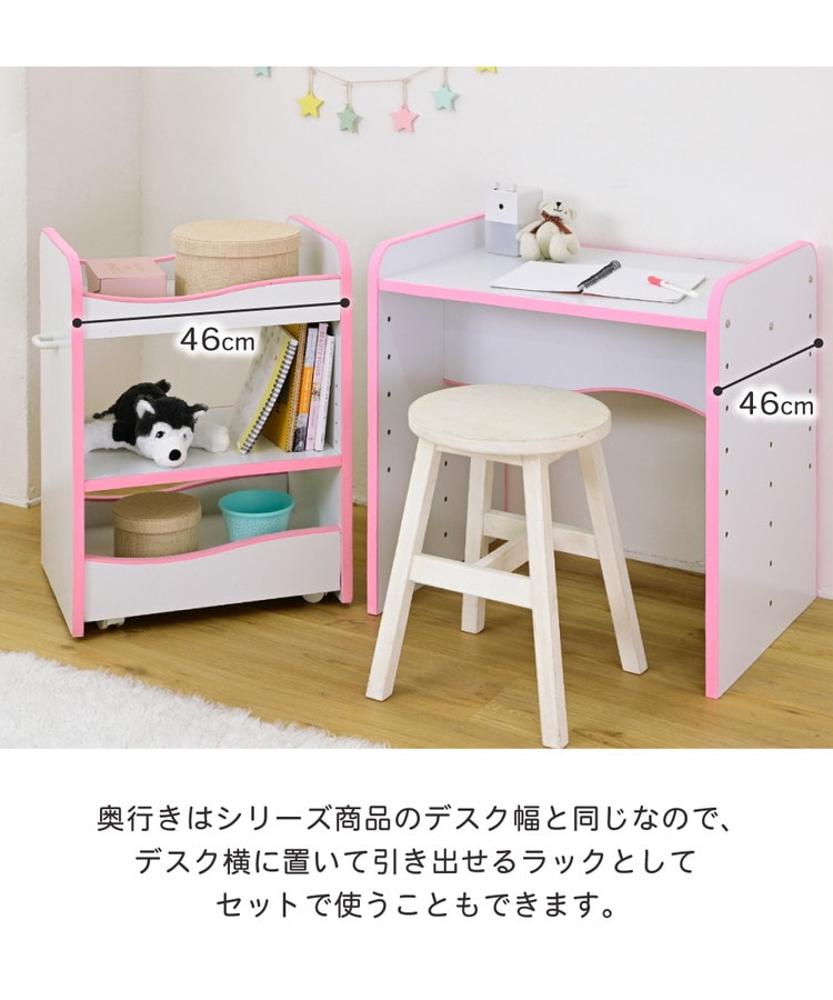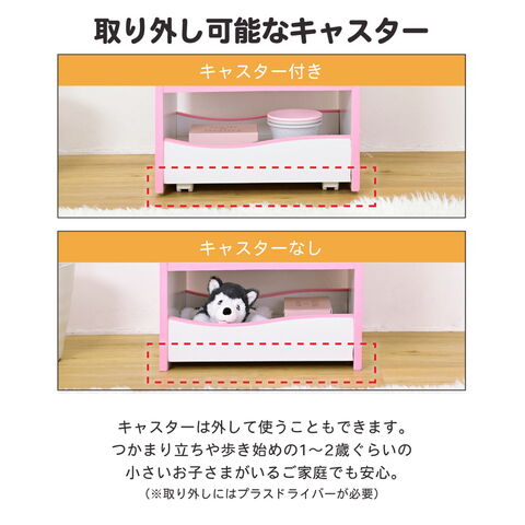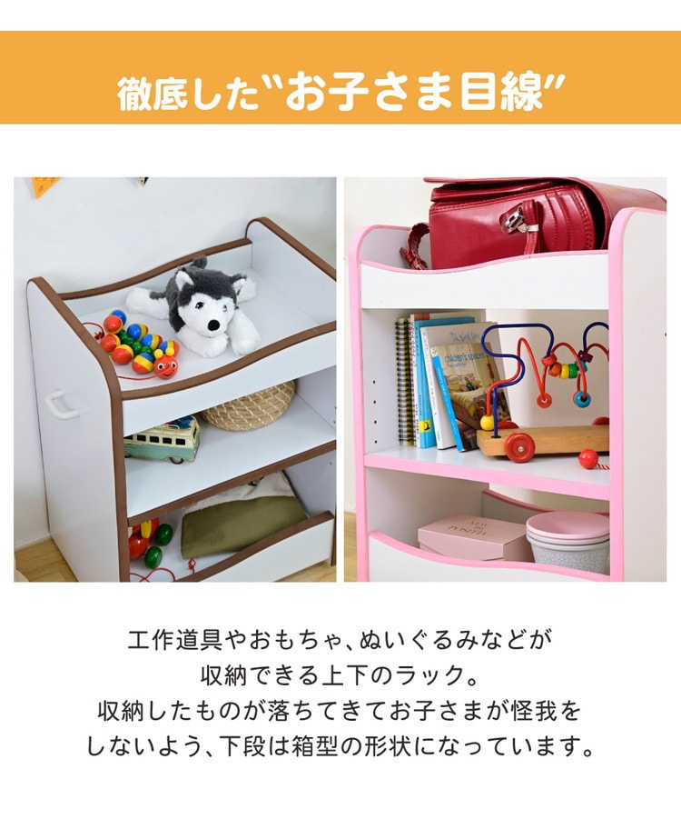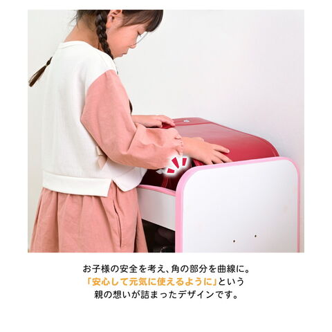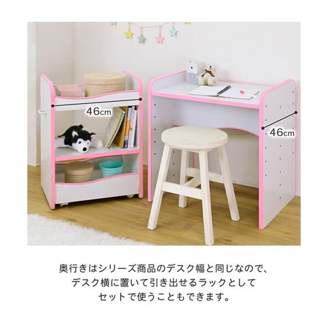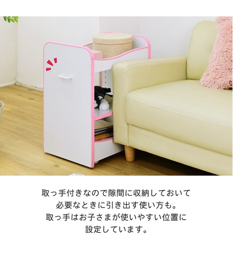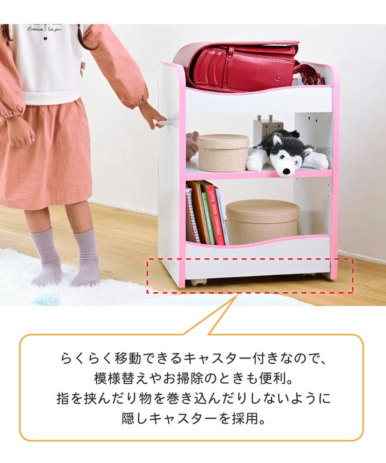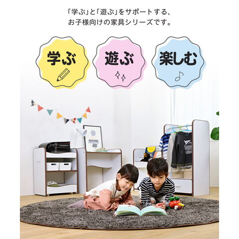 弾力性、衝撃吸収に優れたEVA樹脂をすべてのフチに採用。さらに角を丸くして金具の使用を極力減らした、小さなお子様も安全にご使用いただけるシリーズです。お子様の目線に合わせた収納ワゴンは、ランドセルも置けるサイズ感。キャスター付きなので移動が楽々で、子供部屋だけでなくリビング学習のお供にも。