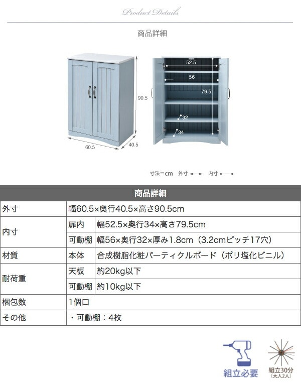 バイカラーで魅せるフレンチカントリースタイルのキャビネット。コンパクトサイズなので一人暮らしにも最適。扉収納の中は、可動棚で収納物に合わせて高さを自由に変えられます。丸みを帯びたフォルムと、アンティーク調の取っ手といったディテールがカントリーテイストを漂わせます。