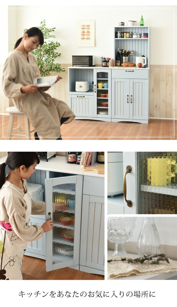 バイカラーで魅せるフレンチカントリースタイルのキッチンカウンター。コンパクトサイズなので一人暮らしにも最適。スライド棚のついたスペースは2口コンセント付で、炊飯器やポットなど調理家電の収納に最適。深めの引出はペットボトルの収納も可能です。ガラス扉収納の中は、可動棚で収納物に合わせて高さを自由に変えられます。丸みを帯びたフォルムと、アンティーク調の取っ手といったディテールがカントリーテイストを漂わせます。