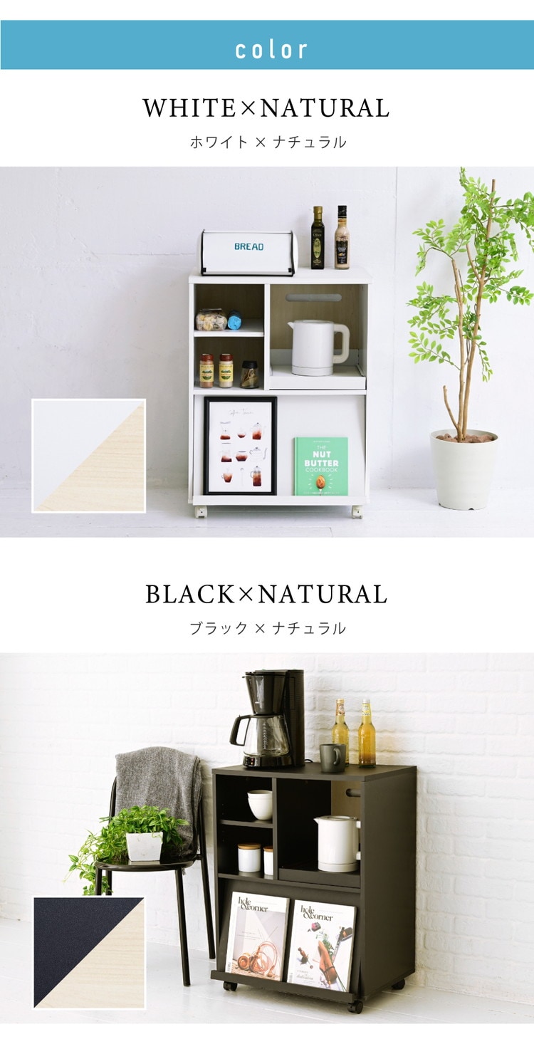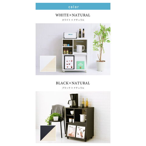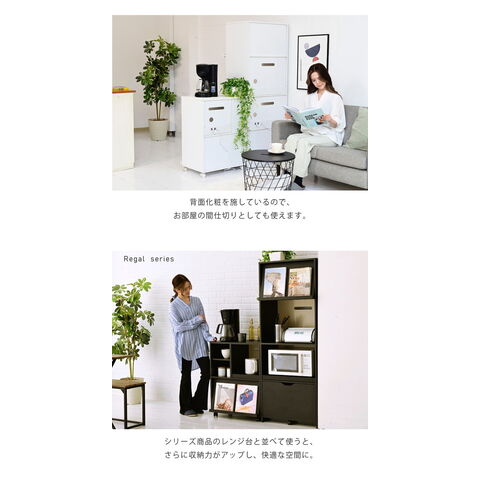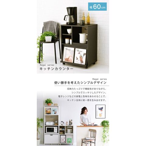 さりげないツートーンが印象的なキッチンシリーズRegal。コンパクトながらもオープンラックやスライド収納、フラップ扉など豊富な収納を備えた機能的なキッチンカウンターです。キャスター付きで移動も楽々です。