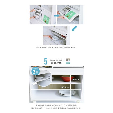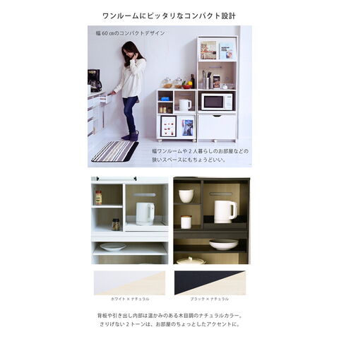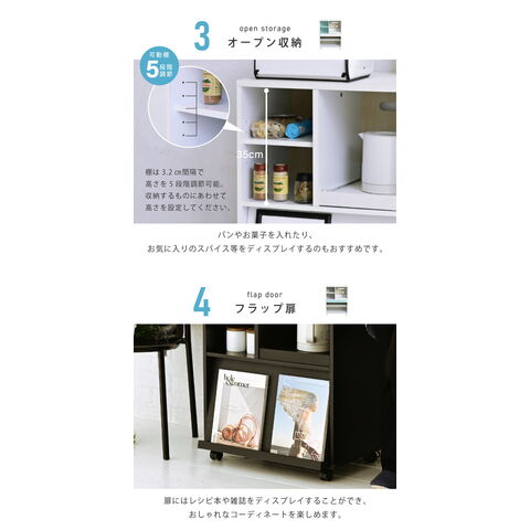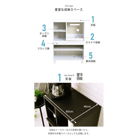 ホワイト、ブラック、白、黒、キッチンキャビネット、レンジラック、レンジボード、キッチンボード、収納棚、おしゃれ、台所、家電収納ラック、収納庫、便利、ストッカー、フラップ扉、キッチンラック、省スペース、炊飯器ラック、両面、北欧、食器棚、小さめ、コンセント付
