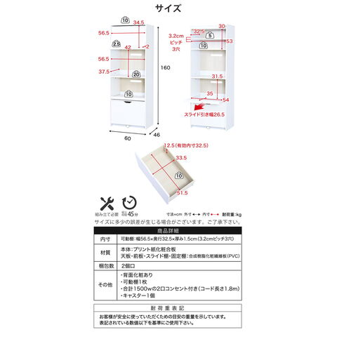スライドテーブル、コンセント付き、大型レンジ対応、おしゃれ、シンプル、北欧、ホワイト、一人暮らし、大容量、高さ160cm、カップボード、家電収納ラック、キッチンキャビネット、キッチンラック、キッチン収納棚、オープンラック、収納ラック