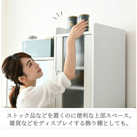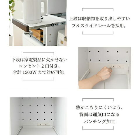 家電が収納できるスライドテーブル2つに加えて、食器類の収納に便利な扉収納付き。