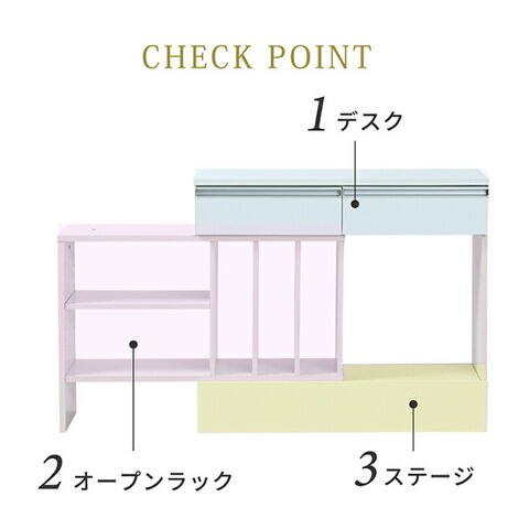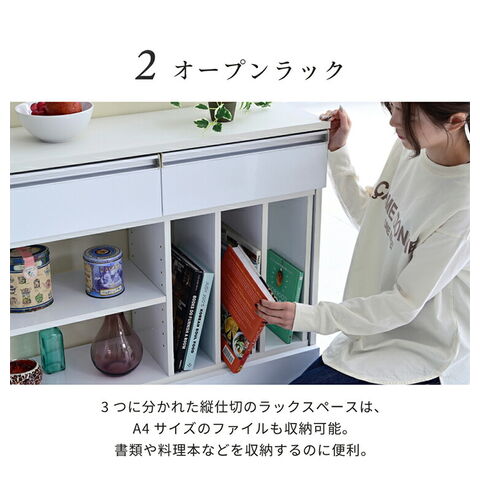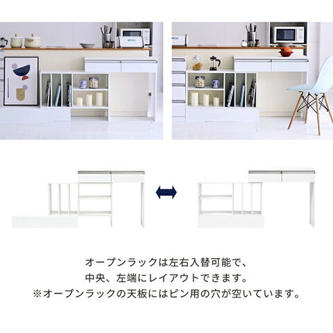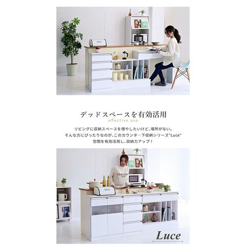 カウンター下のデッドスペースを有効活用できる収納シリーズ“Luce”。用途やスペースに合わせて自由に伸縮できる、ラックとしても使えるデスクです。真ん中のオープンラックを反転すればレイアウトの変更もできます。