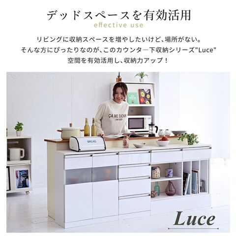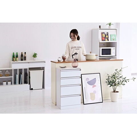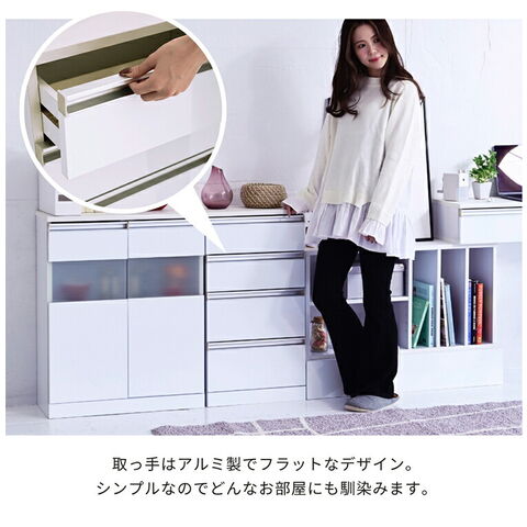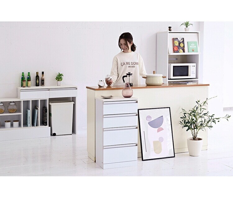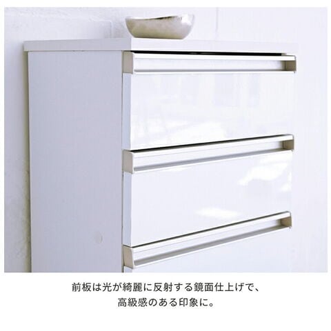 カウンター下のデッドスペースを有効活用できる収納シリーズ“Luce”。鏡面仕上げで高級感をプラスするシンプルな4段チェスト。キッチン、ダイニング周りのこまごましたものを収納するのにぴったりです。
