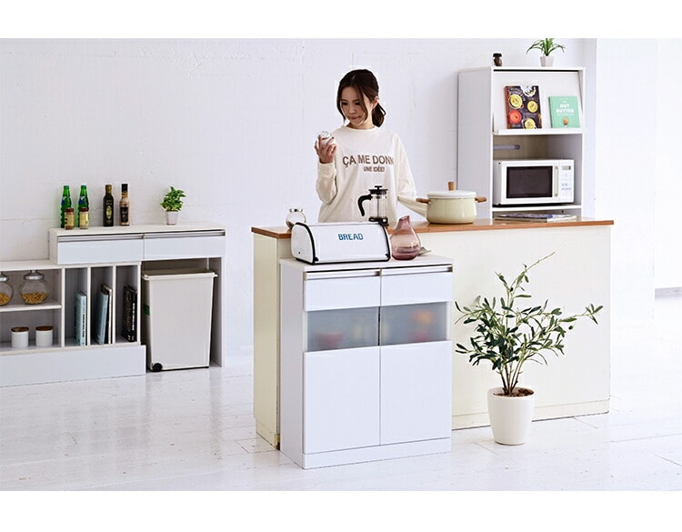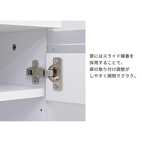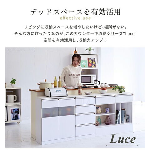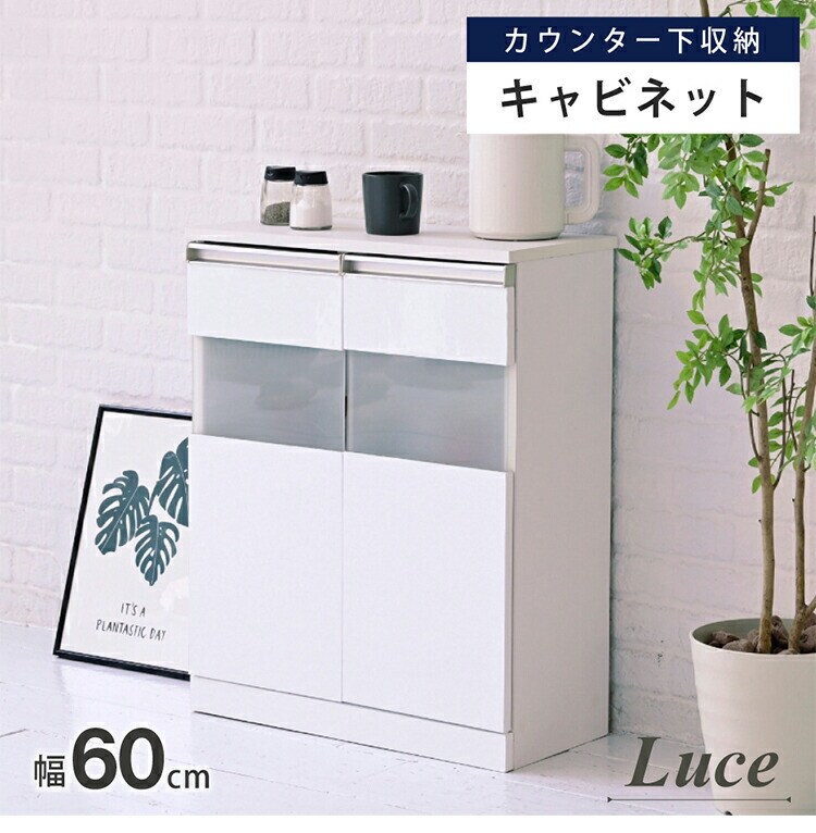 カウンター下のデッドスペースを有効活用できる収納シリーズ“Luce”。鏡面仕上げで高級感をプラスするシンプルなキャビネット。収納するものに合わせて棚位置を変えられる可動棚タイプ。扉を閉めれば収納物が見えないので、見た目もすっきり。